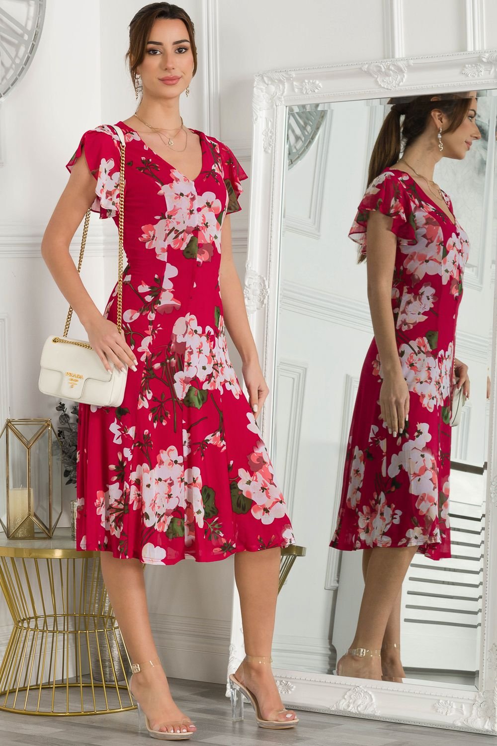 Charming midi dress in plum floral print by Jolie Moi. Made from soft mesh fabric, it features a V-neckline and soft pleating at the shoulders. The fabric-covered buttons down the front add a touch of glamour.