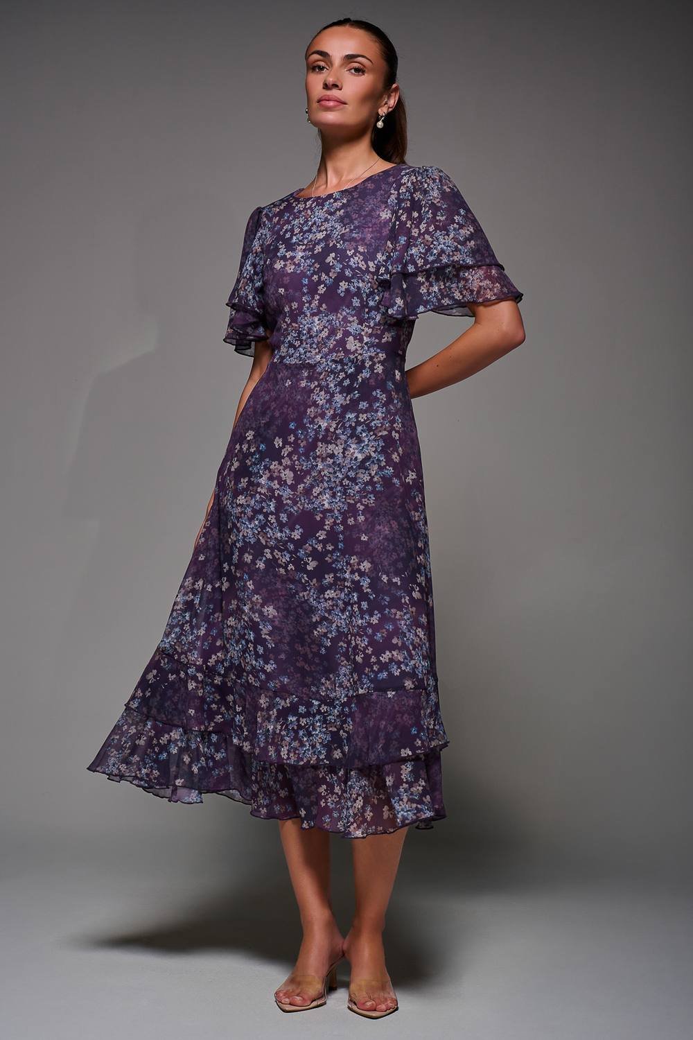 Charming purple chiffon midi dress by Jolie Moi, featuring a round neckline, tie waist, and concealed zip at the back. The dress boasts soft, 2-layer short flowy sleeves and a double-frilled hem for a romantic touch. Practical side pockets make it a versatile piece.