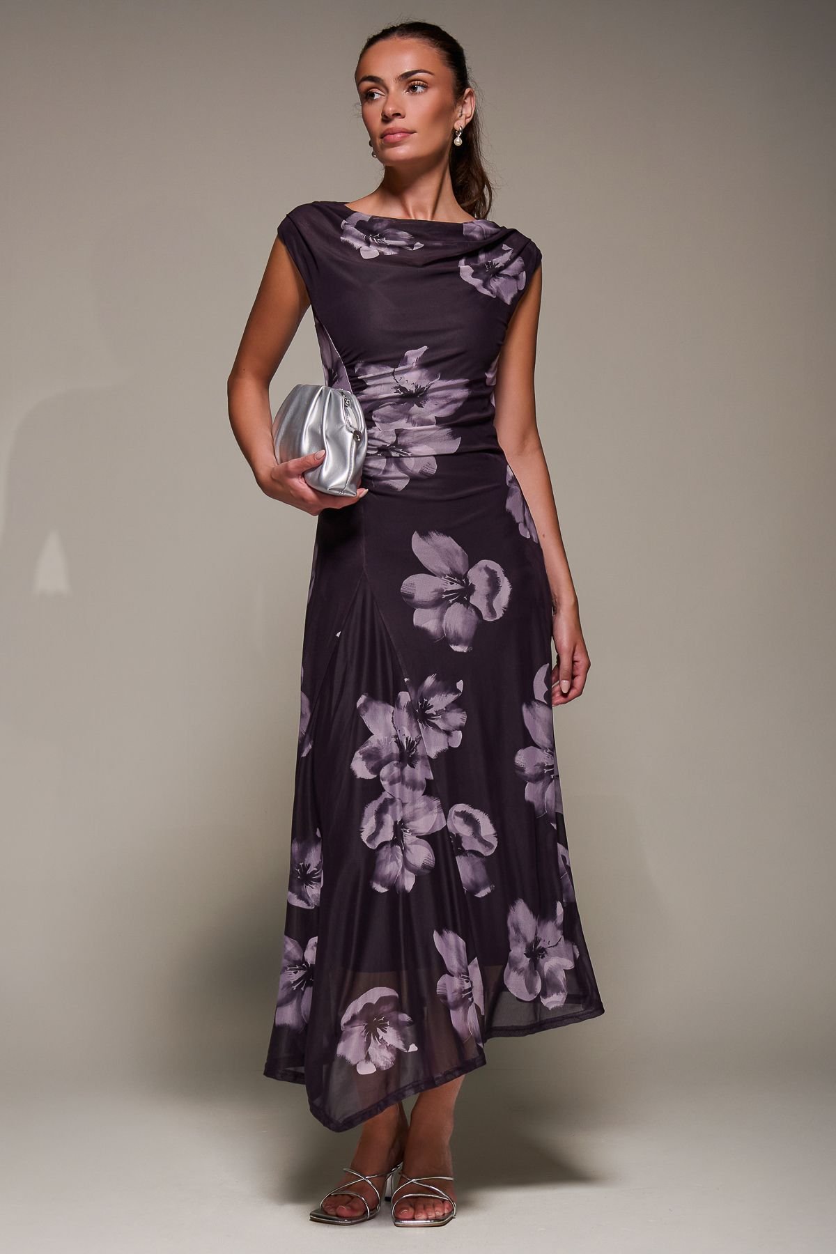 Stylish maxi dress in purple floral mesh with a ruched neckline and side draping. Perfect for evening events or special occasions.