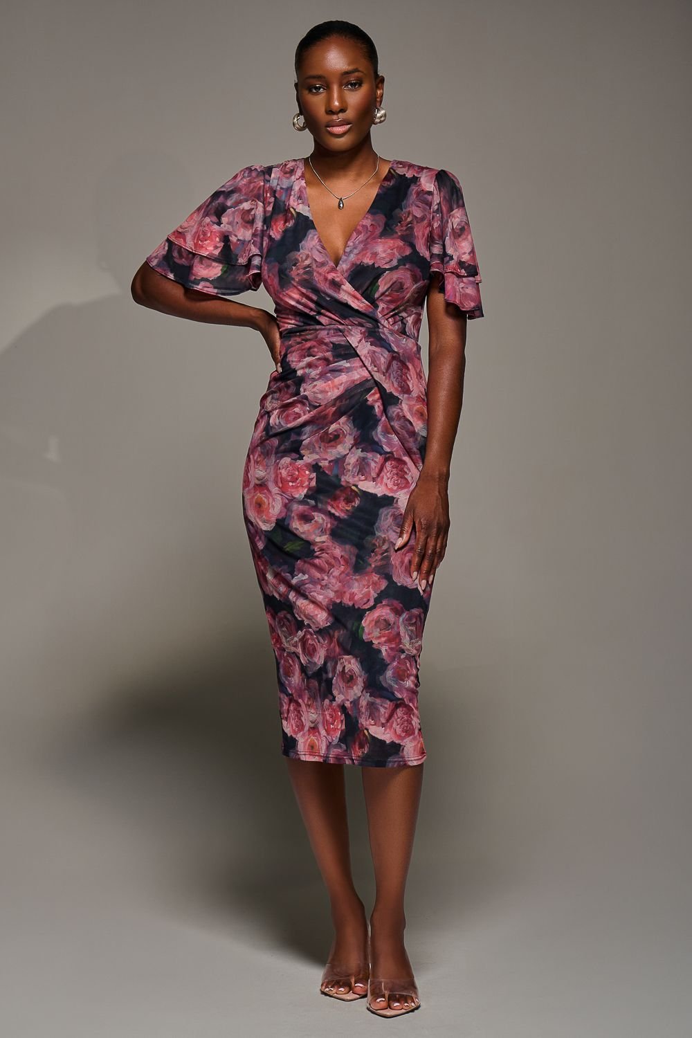 Embrace feminine charm in Jolie Moi's red floral print bodycon dress. Crafted from soft, airy fabric, this midi dress features a flattering bodycon silhouette, pleated waist detailing, and double-layered ruffle sleeves. The gorgeous V-neckline adds an elegant touch.