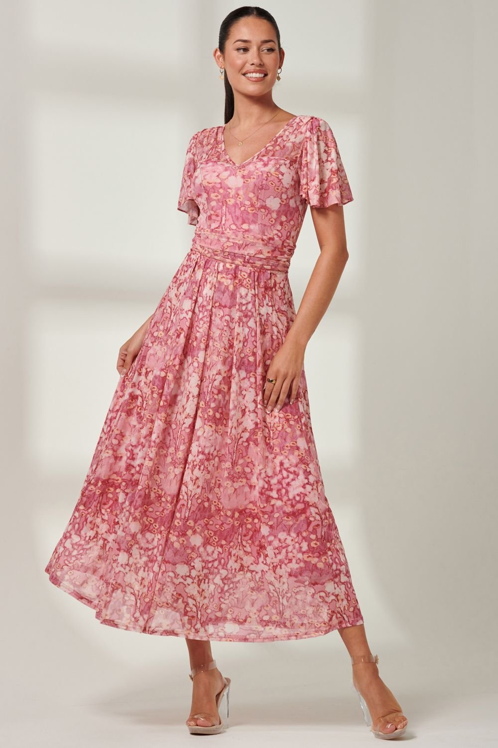 Charming red floral print maxi dress with a flattering V-neckline and short angel sleeves. Features a pleated hemline and an elasticated ruched waistband for a form-fitting silhouette. Ideal for evening events or date nights.