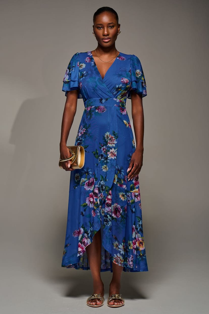 Charming maxi dress in royal blue with a floral print. Features a V-neckline, angel sleeves, and a frilly hemline. Ideal for evening events or special occasions.