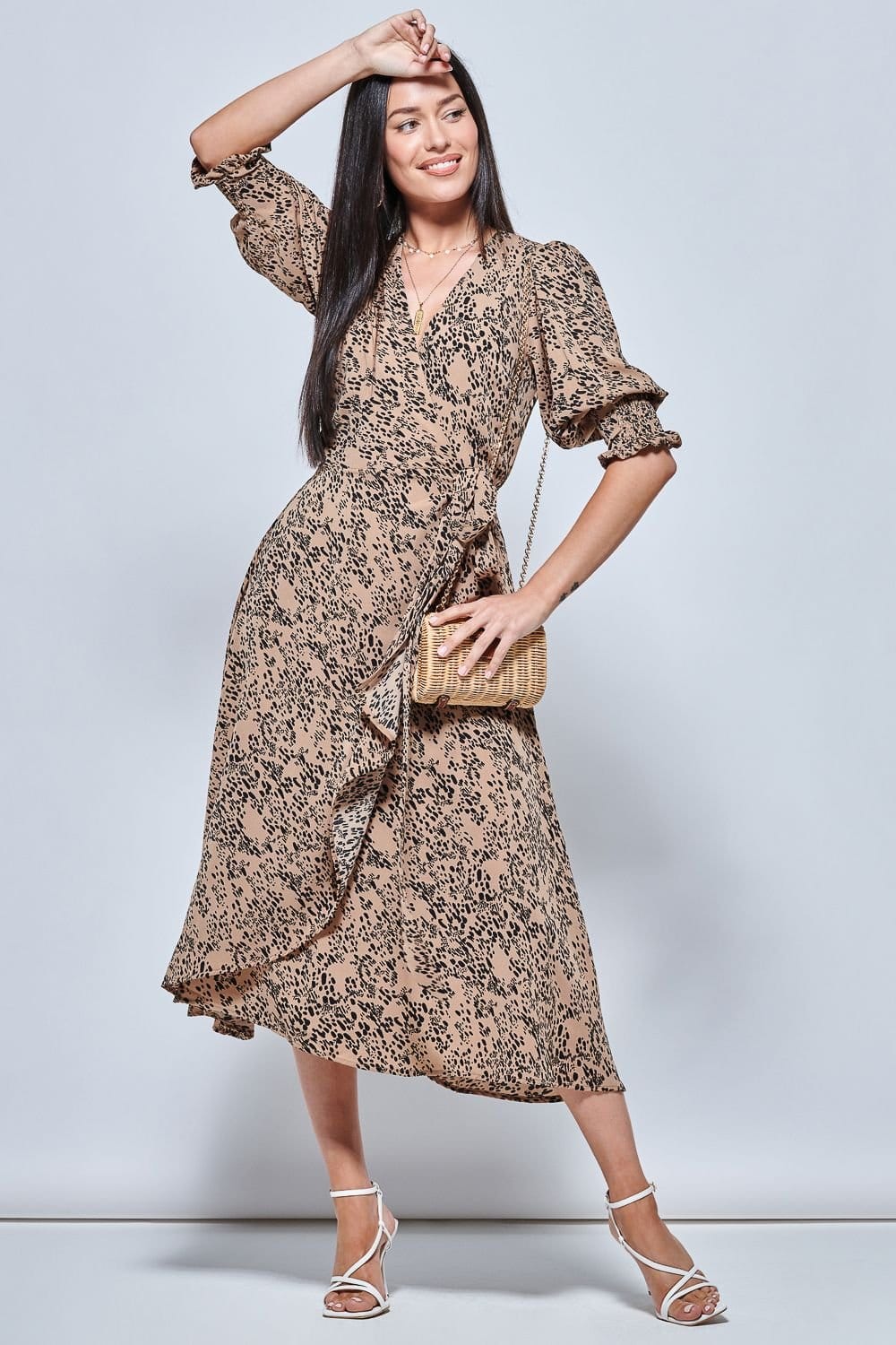 Dress to impress this season with this stunning crepe wrap midi dress from Jolie Moi. Complimented by a striking animal print, elbow-length ruched sleeves, and a high-low wrapped hemline that falls just below the knees. Perfect for summer events.