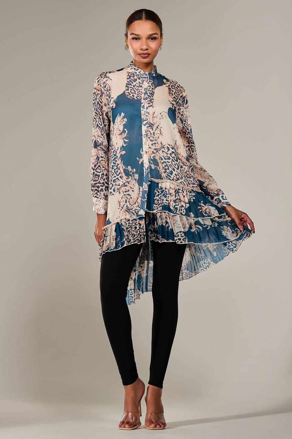 Pair with black leggings and clear heels for a chic evening look, or wear with white jeans for a daytime casual vibe.