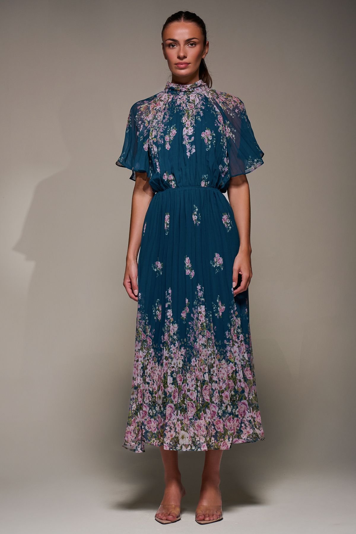 Charming Teal floral chiffon dress by Jolie Moi. Features a high neckline with a tie at the back and short cape-style sleeves. The ruched waistband shapes the waist for a flattering fit.