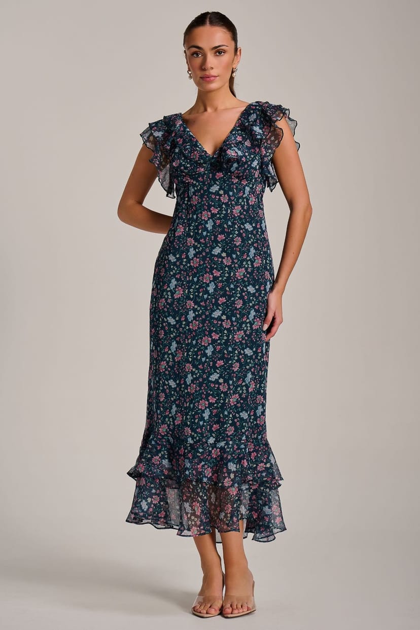 Charming Teal floral chiffon midi dress from Jolie Moi. Featuring a ruffled V-neckline and short ruffle sleeves, this dress boasts a playful three-tiered ruffle skirt for a feminine and elegant silhouette.