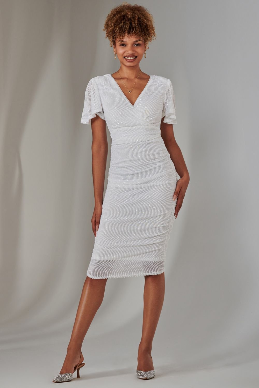 The Jolie Moi White Sequin Ruched Flare Sleeve Dress is available in sizes 8.