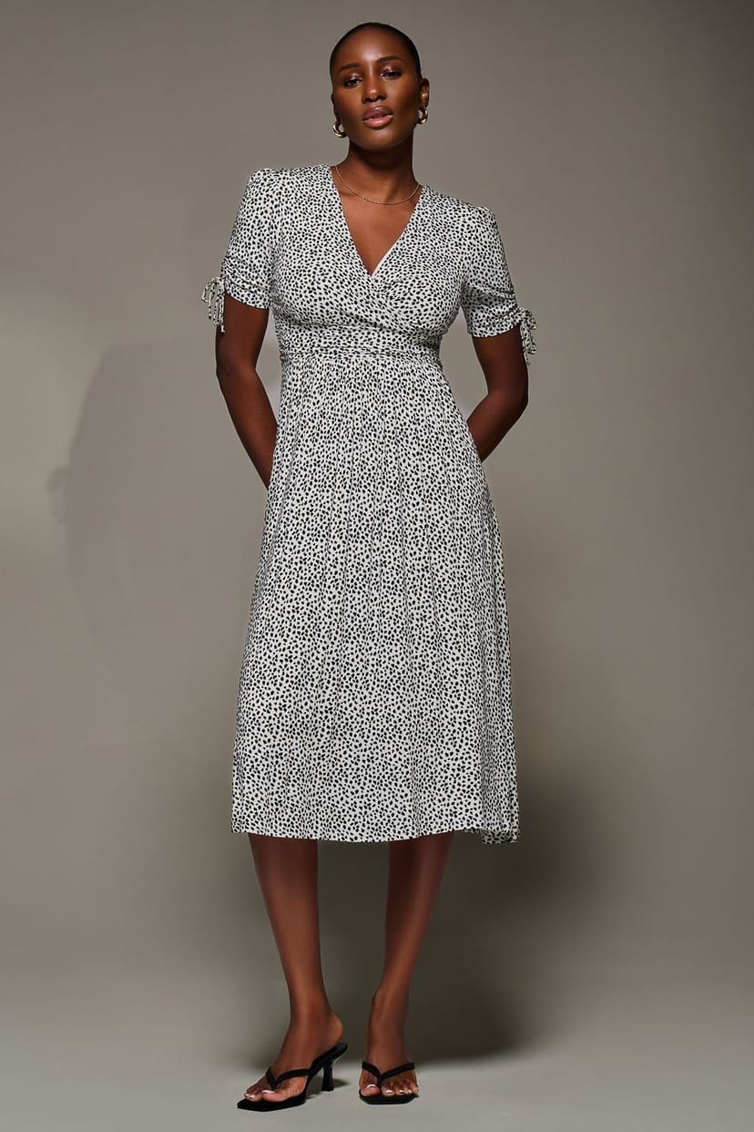 Stylish midi dress by Jolie Moi in white jersey with a playful dot print. Features a flattering V-neckline and tie-detail sleeves that create a gathered effect. The front waistband is gently gathered to perfectly fit, while the ruched waistline adds a flattering silhouette with two discreet side pockets.