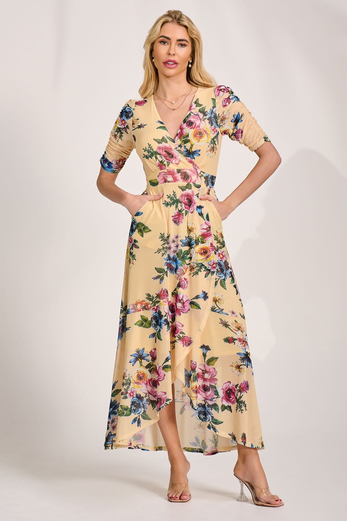 This yellow floral print mesh maxi dress by Jolie Moi features a wrap front with V-neckline and a fitted waistband. The wrap skirt has a high-low hem with frill detailing and two pockets. It has elastic ruched short sleeves, a tie at the waist, and is fully lined for comfort.