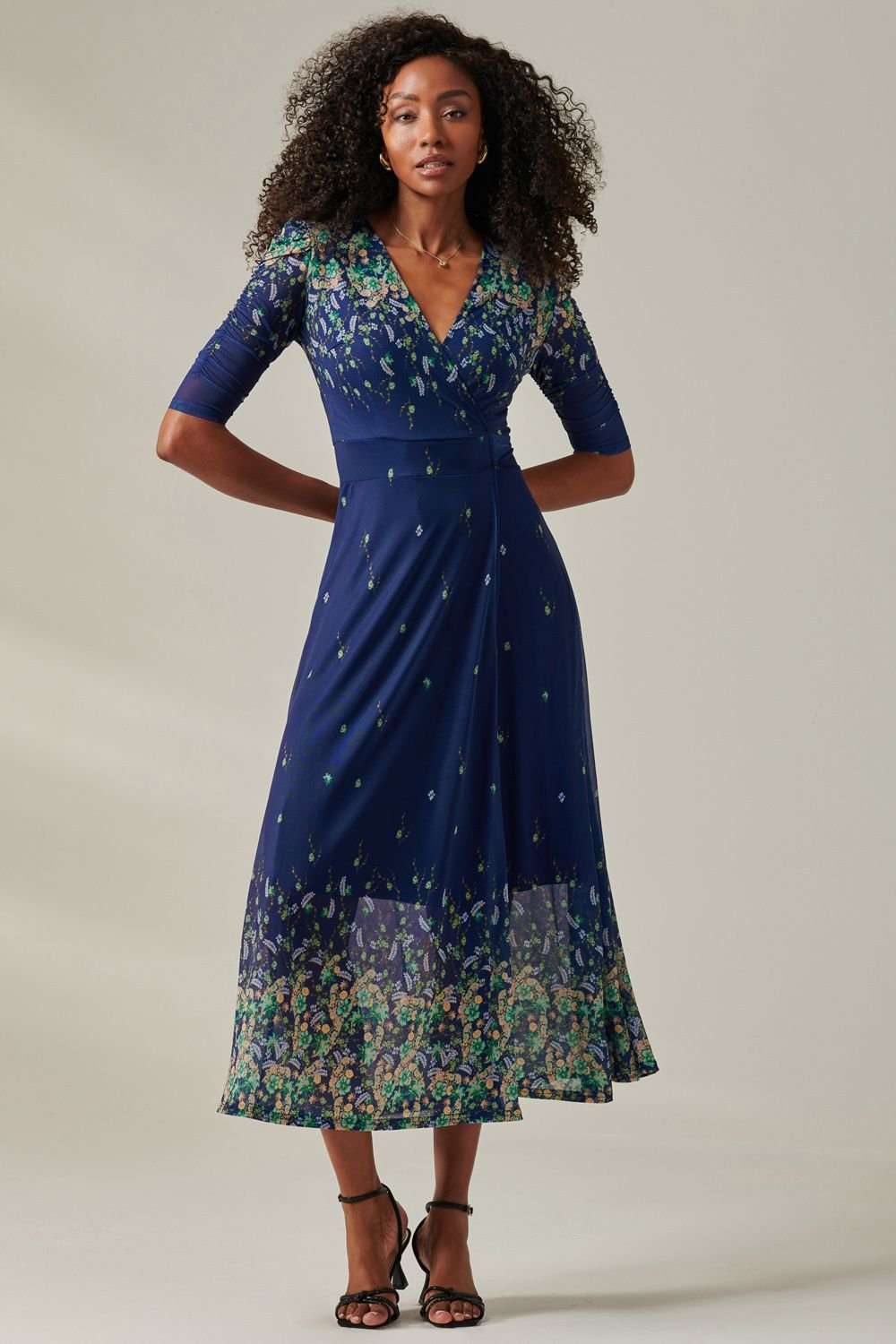 Elegant yellow floral print wrap mesh maxi dress from Jolie Moi. Features a wrap-over design with a self-tie waist belt for a tailored silhouette. The ruched elbow-length sleeves add a touch of refined charm.