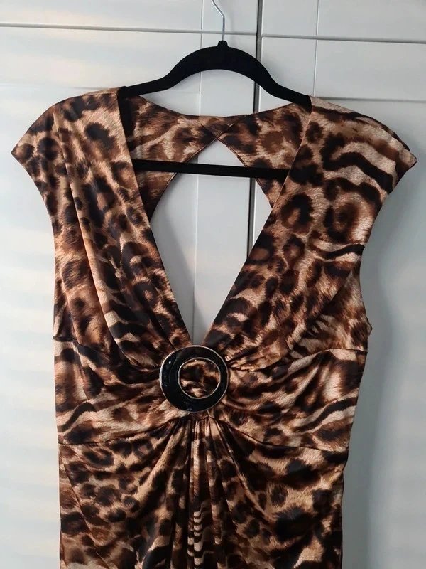 The Joseph Ribkoff Animal Print Evening Dress in Brown is available in sizes L.