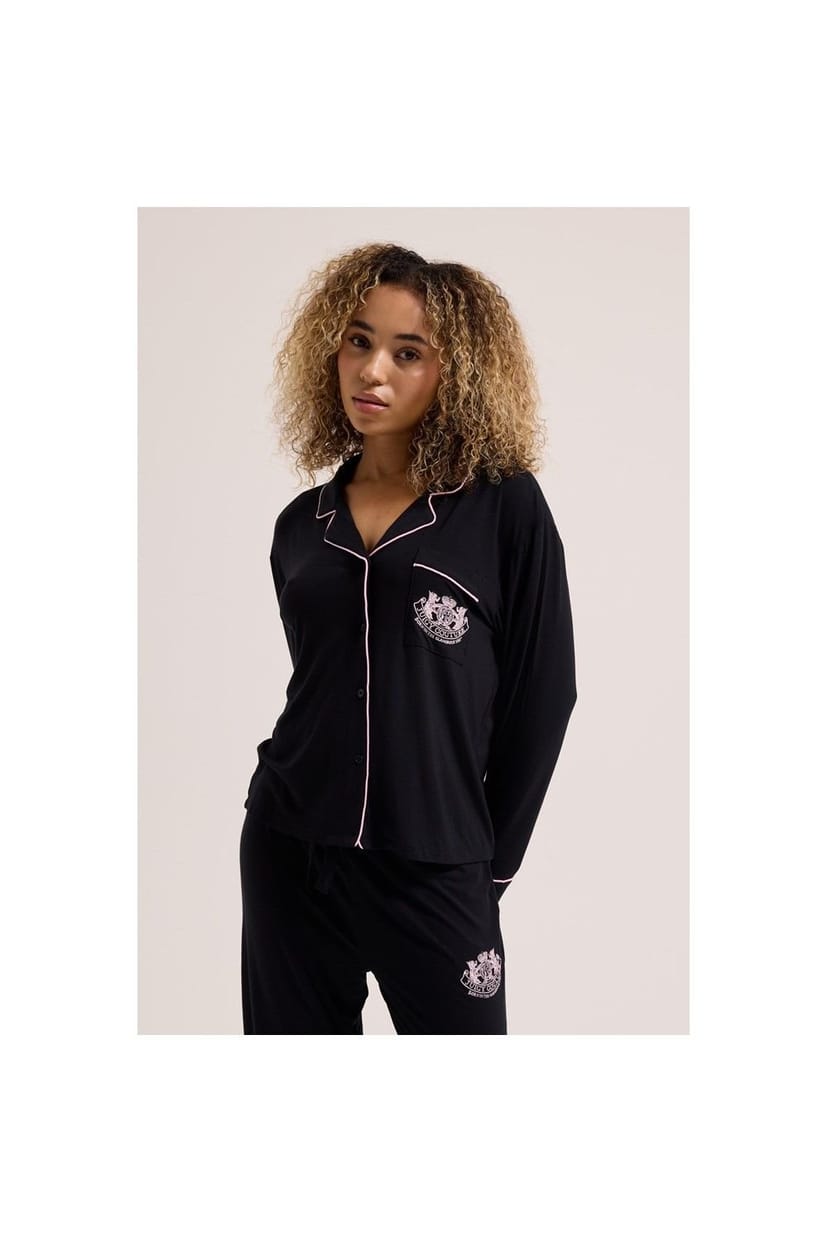 Luxurious black jersey pyjama set featuring a long-sleeved shirt with contrast tipping detail. The set includes a collared shirt with a branded crest logo at the chest pocket and drawstring bottoms with a crest logo at the hip. Ideal for a comfortable night's sleep.
