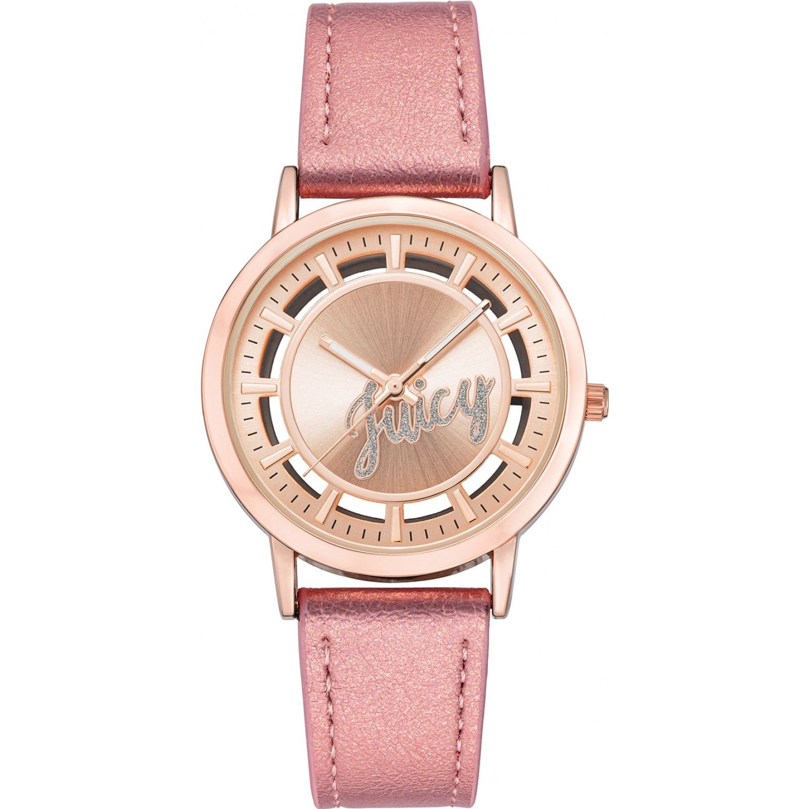 Elegant pink quartz watch from Juicy Couture, featuring a rose gold-tone case and pink leather strap. The face has a sparkly 'Juicy' branding and roman numeral markers. Ideal for adding a touch of glamour to any outfit.
