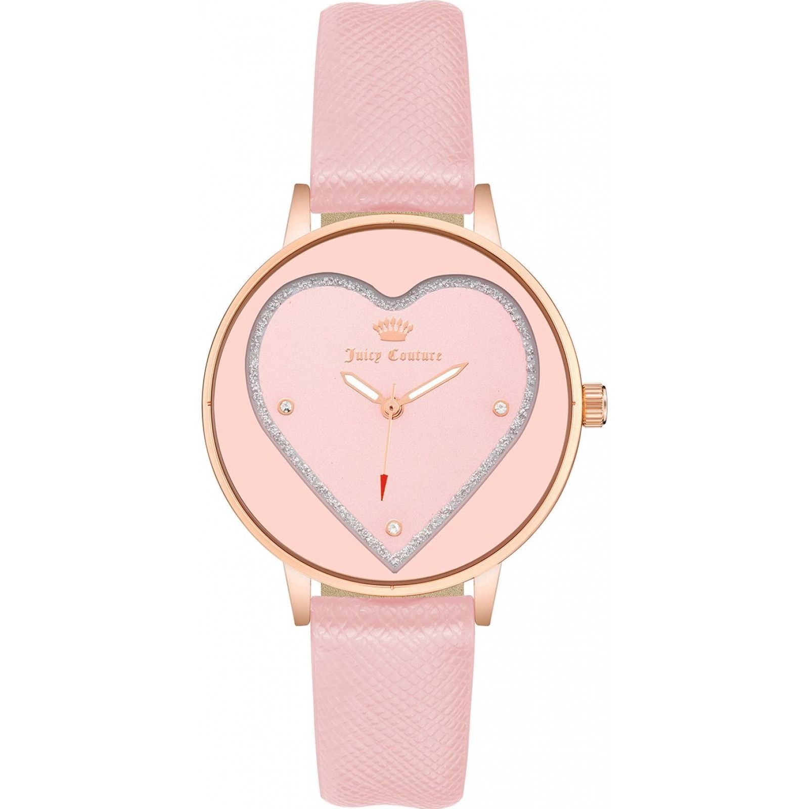 This pink quartz watch from Juicy Couture features a heart-shaped dial adorned with sparkling crystals. The rose gold-tone case and pink leather strap add a touch of elegance. Ideal for any occasion, this watch combines style and sophistication.