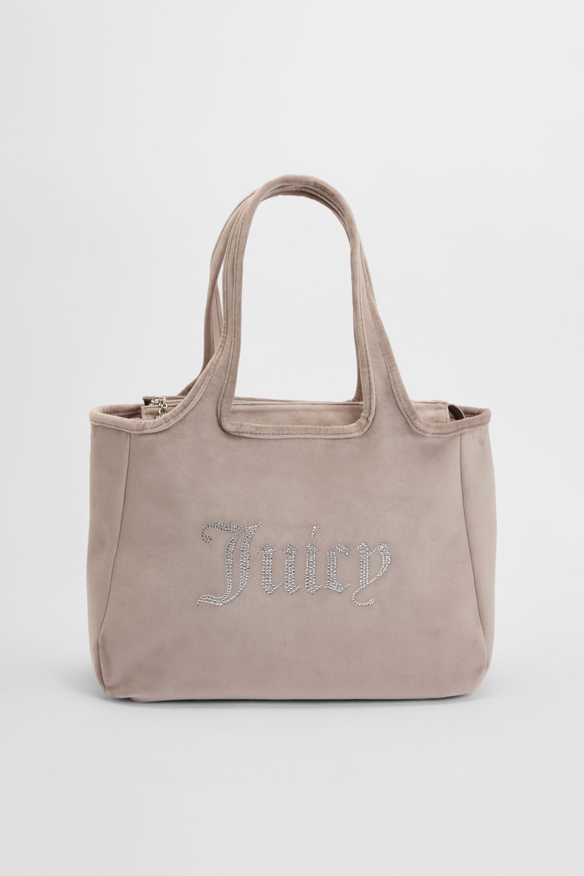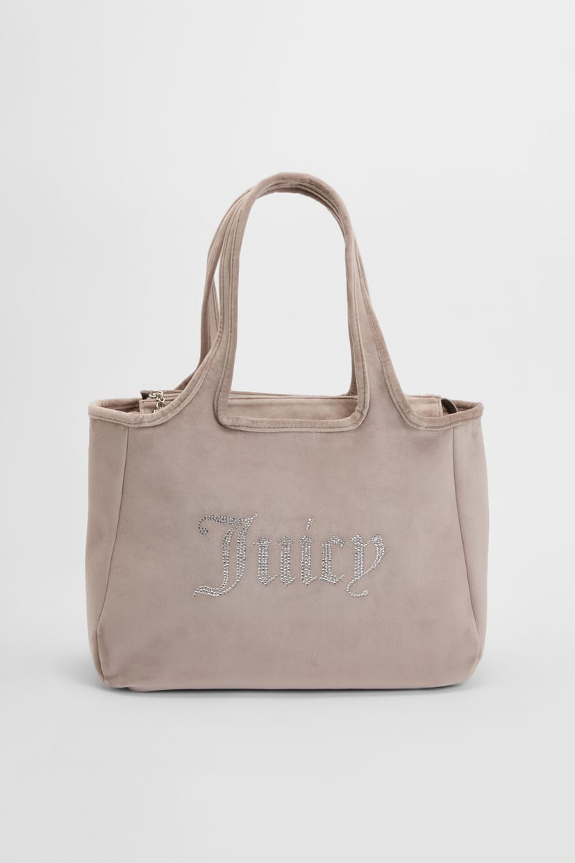 View Debenhams's returns policyThis taupe polyester handbag from Juicy Couture features a double handle design and crystal-embellished branding. Ideal for everyday use with its spacious interior and chic aesthetic.