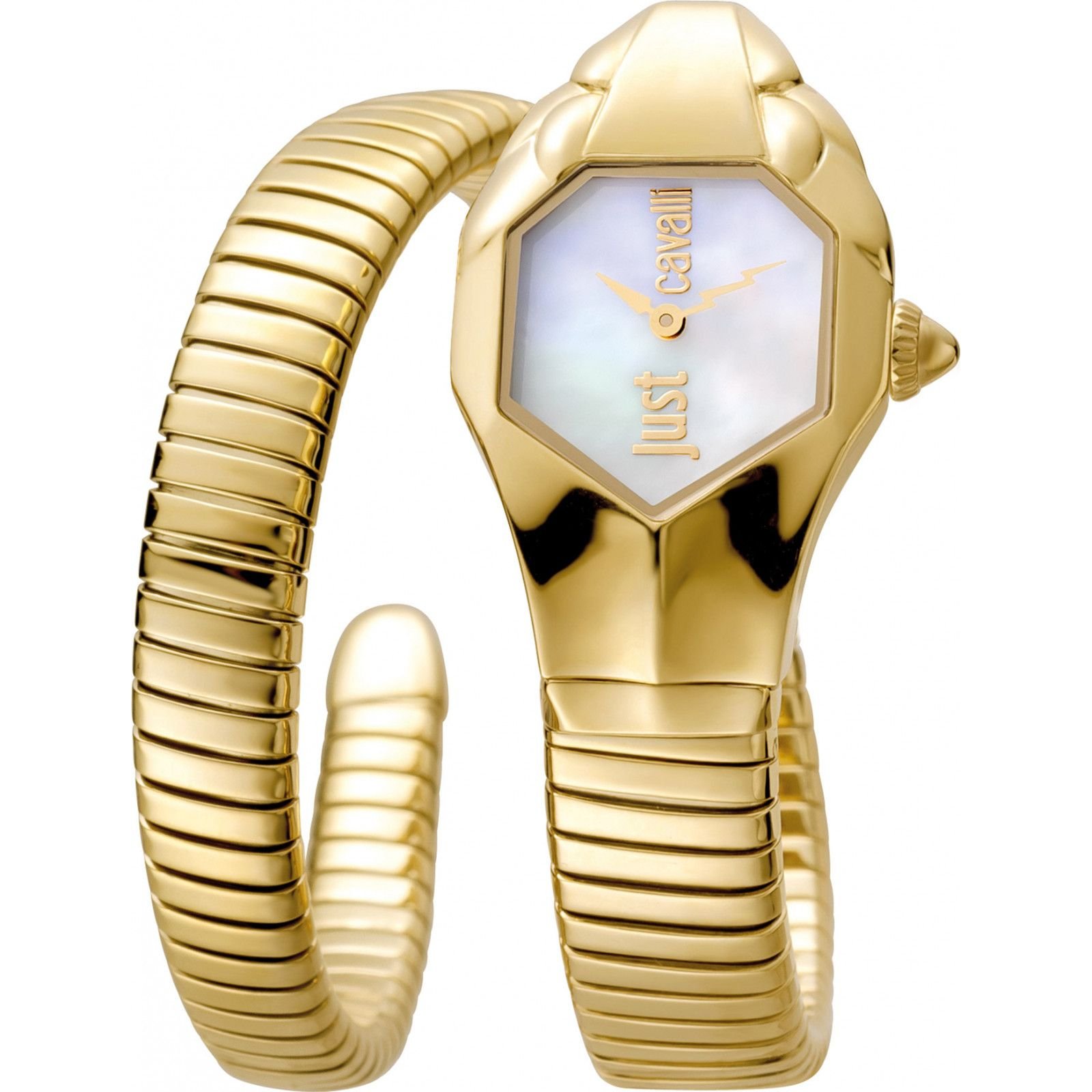 Luxurious gold watch from Just Cavalli, featuring a snake-like strap and a diamond-like mother-of-pearl dial. Ideal for adding a touch of glamour to any outfit.
