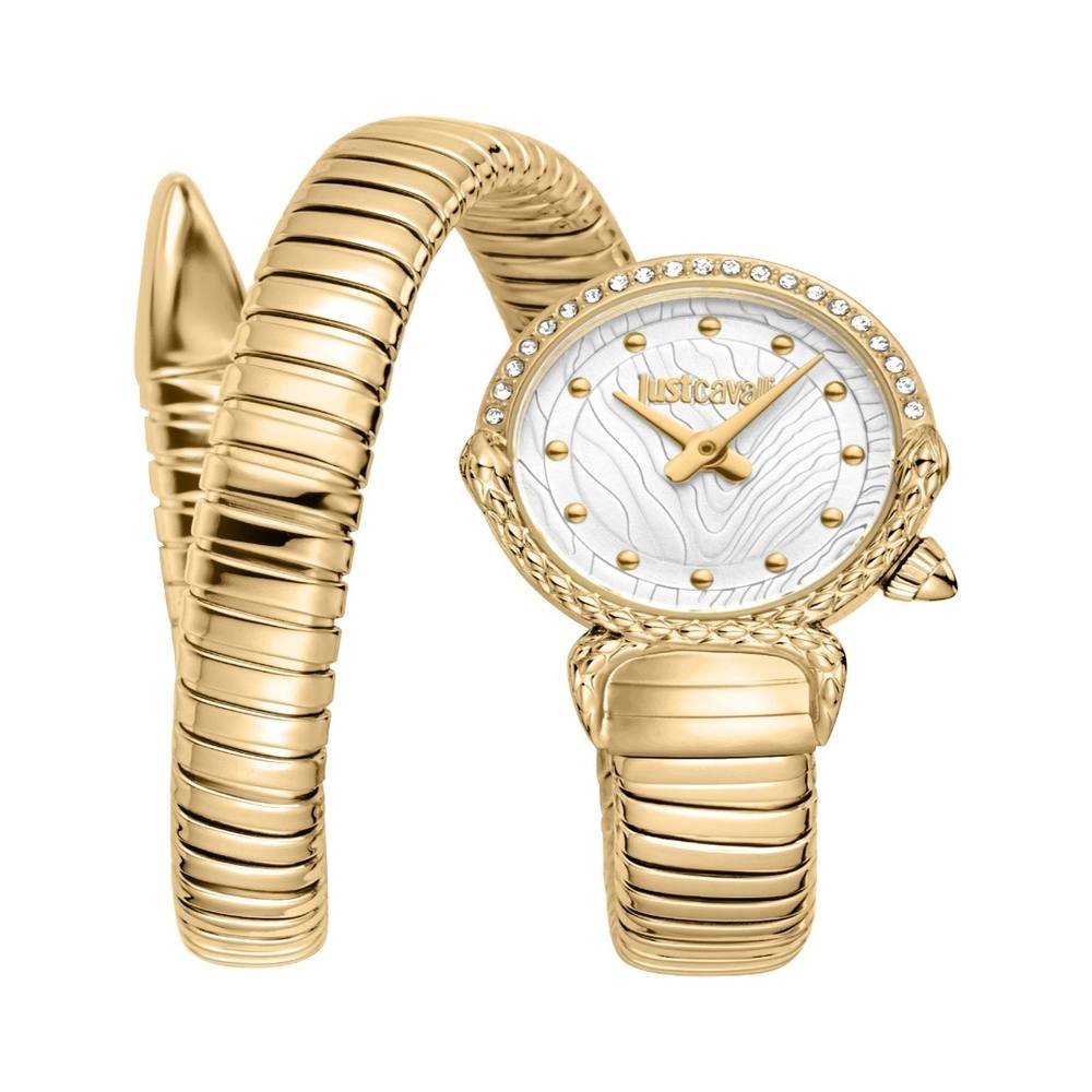 Luxurious Just Cavalli watch featuring a gold-tone case, silver dial, and gold-tone stainless steel bracelet. Adorned with crystal accents for an elegant touch. Perfect for adding a touch of glamour to any outfit.