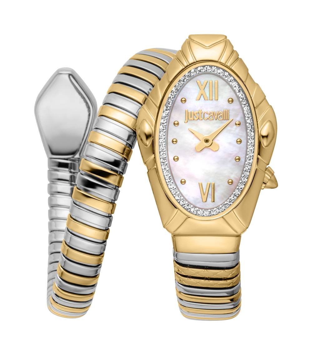 Luxurious two-tone gold dial watch by Just Cavalli. Features a snake-like bracelet with alternating gold and silver bands. The mother-of-pearl dial is adorned with diamond accents, adding a touch of elegance.