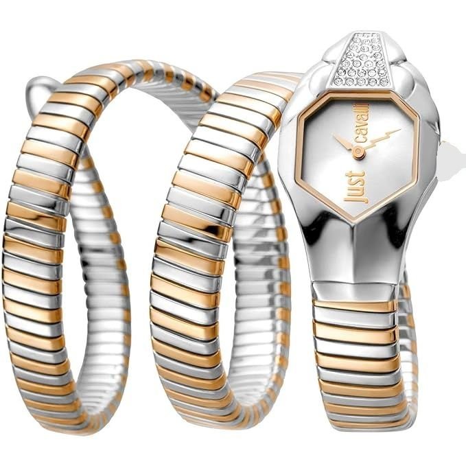 Sleek Just Cavalli watch with a snake-inspired design in silver and gold tones. Features a mineral crystal and a deployment clasp for secure wear.