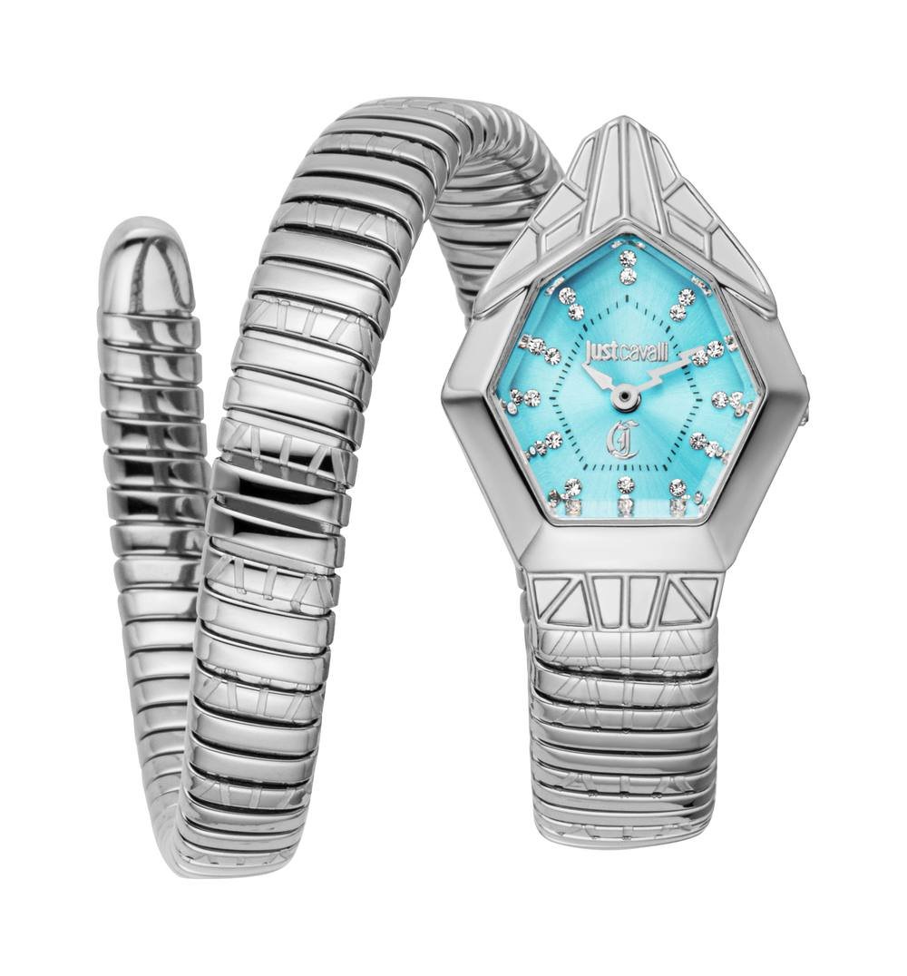 The Just Cavalli Silver & Tiffany Dial Watch is made from stainless steel, diamond.