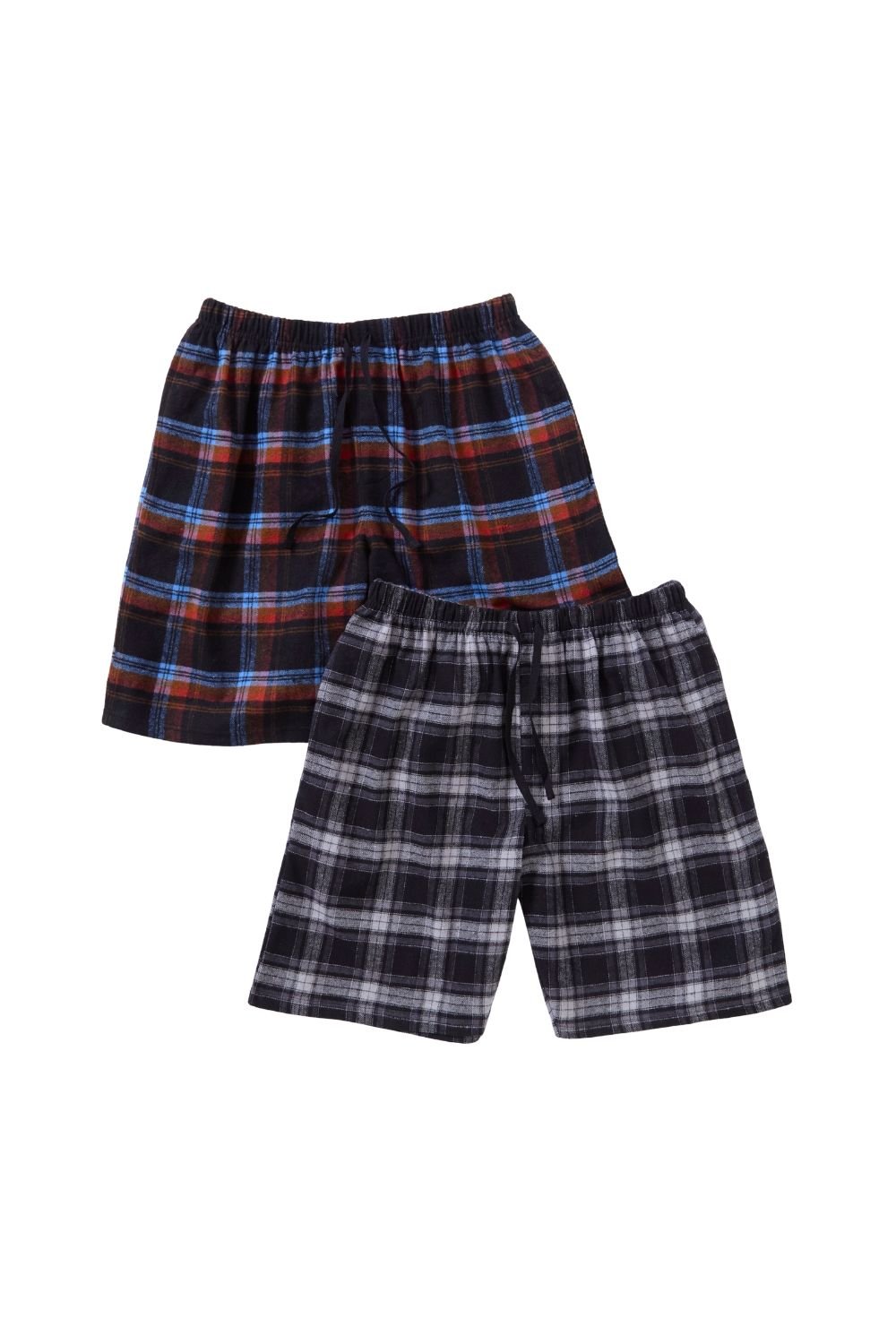 Two pack flannel check pyjama shorts. Featuring two side pockets, an elasticated waistband and draw cord. In a choice of colours, ideal for summer or winter.