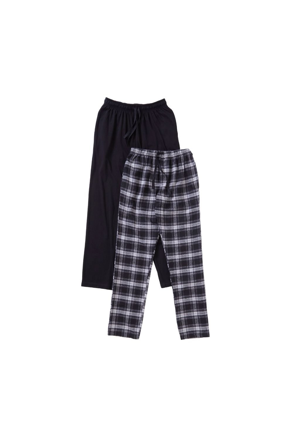 Two pack long pyjama bottoms. The pack contains one flannel check trouser and one plain jersey trouser. Featuring two side pockets, an elasticated waistband, and draw cord. In a choice of colours, ideal for summer or winter.
