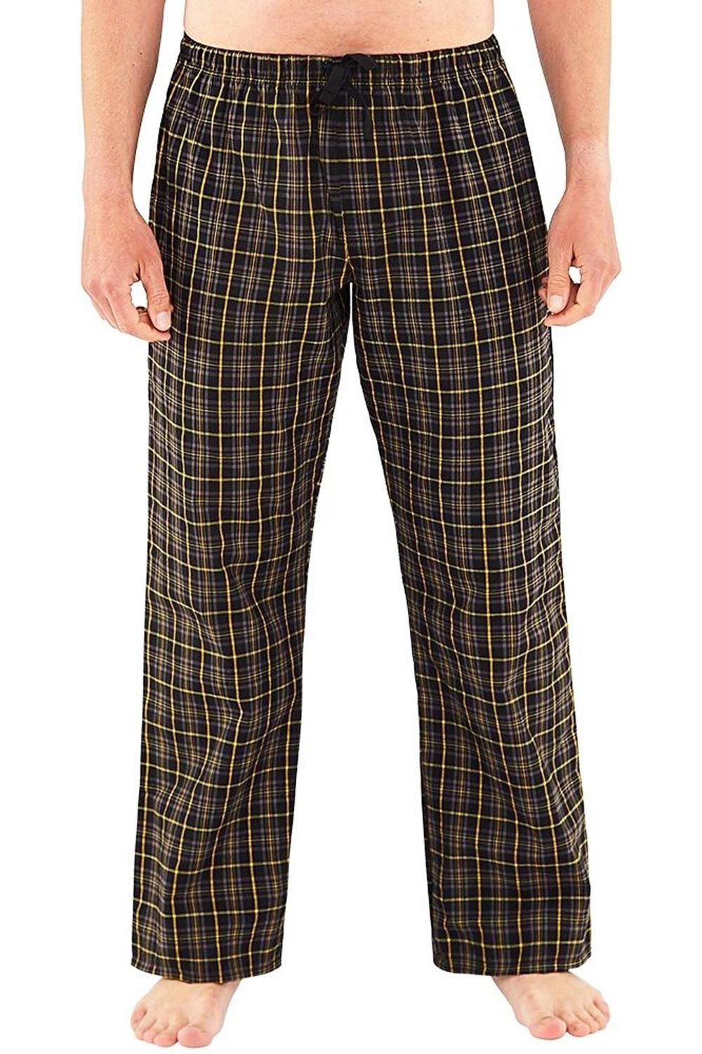 Comfortable check pyjama trousers in black and yellow. Featuring two side pockets, an elasticated waistband with a draw cord, and a relaxed fit. Ideal for lounging or sleeping.