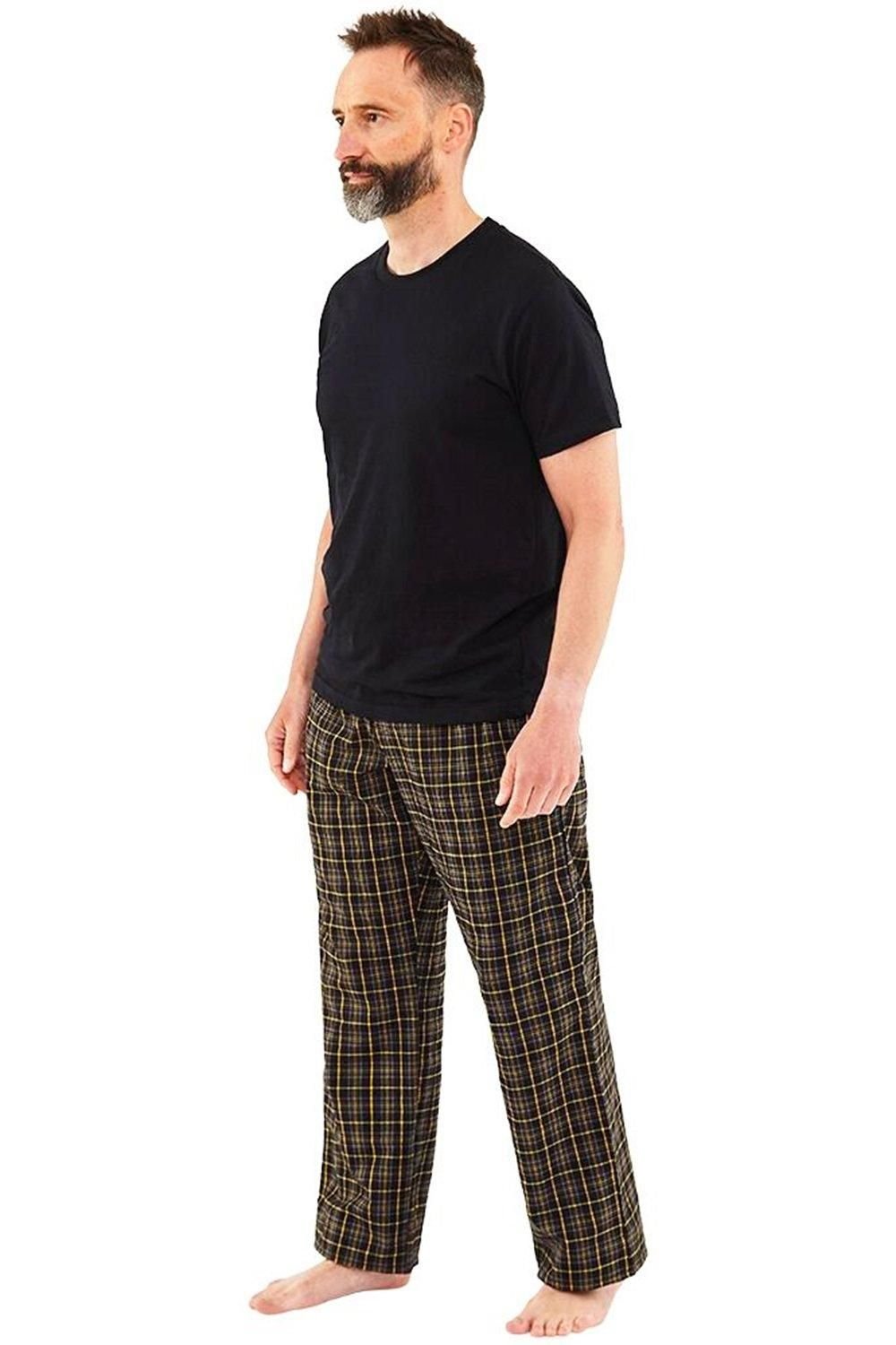 Stylish men's check short pyjama set. The short sleeve T-shirt features a crew neck, while the matching woven check shorts have two side pockets, an elasticated waistband, and a draw cord. Ideal for summer or winter.