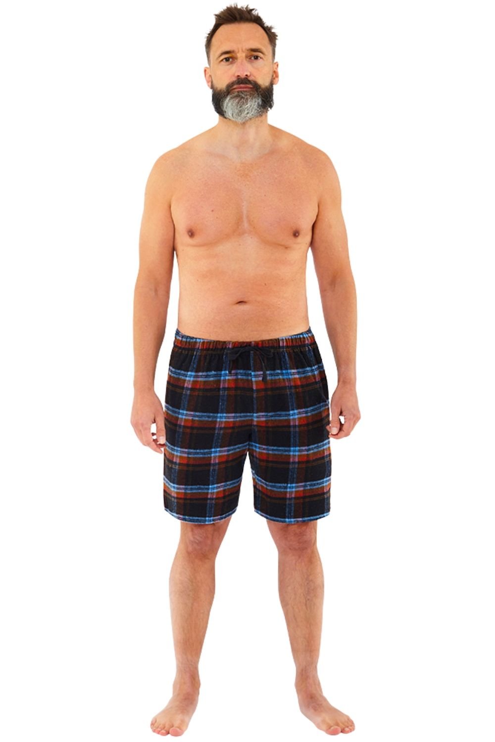 Comfortable pyjama shorts in black flannel with a check pattern. Features two side pockets and an elasticated waistband with a draw cord. Ideal for summer or winter lounging.