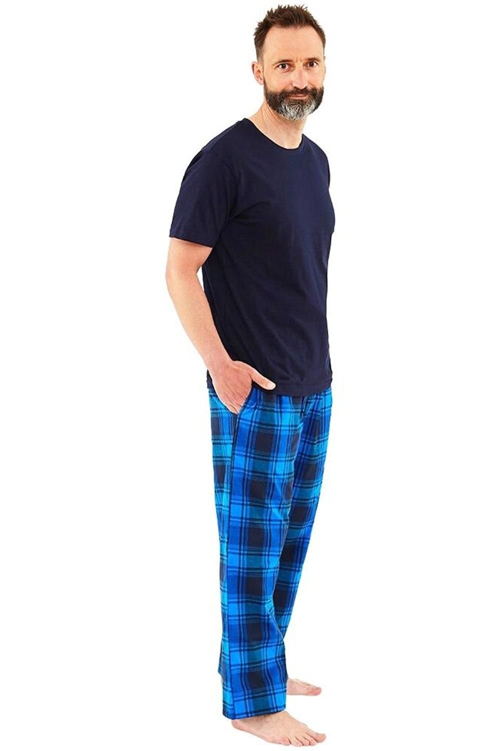 Comfortable men's check short pyjama set in navy. Features a short sleeve T-shirt with a crew neck and matching woven check shorts with two side pockets, an elasticated waistband, and a draw cord. Ideal for both summer and winter.