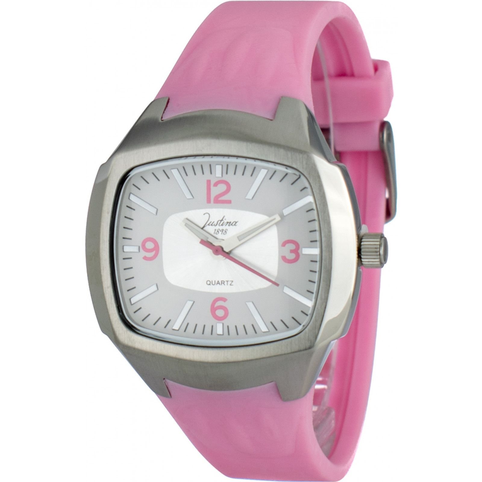 Stylish pink quartz watch from Justina, featuring a square dial and pink silicone strap. The watch is designed for durability and longevity, perfect for everyday wear.