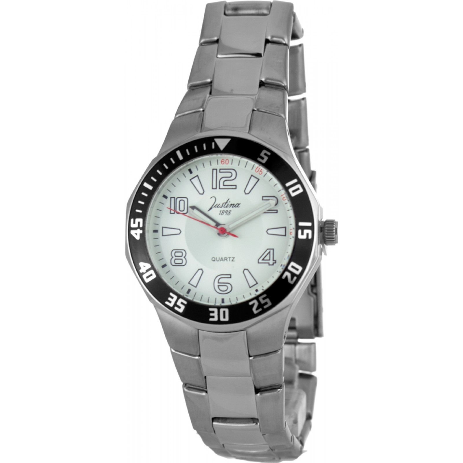 Elegant Justina ladies watch with a silver-tone metal band and a white dial. Features a black bezel with white numbers and quartz movement. A perfect accessory for any occasion.
