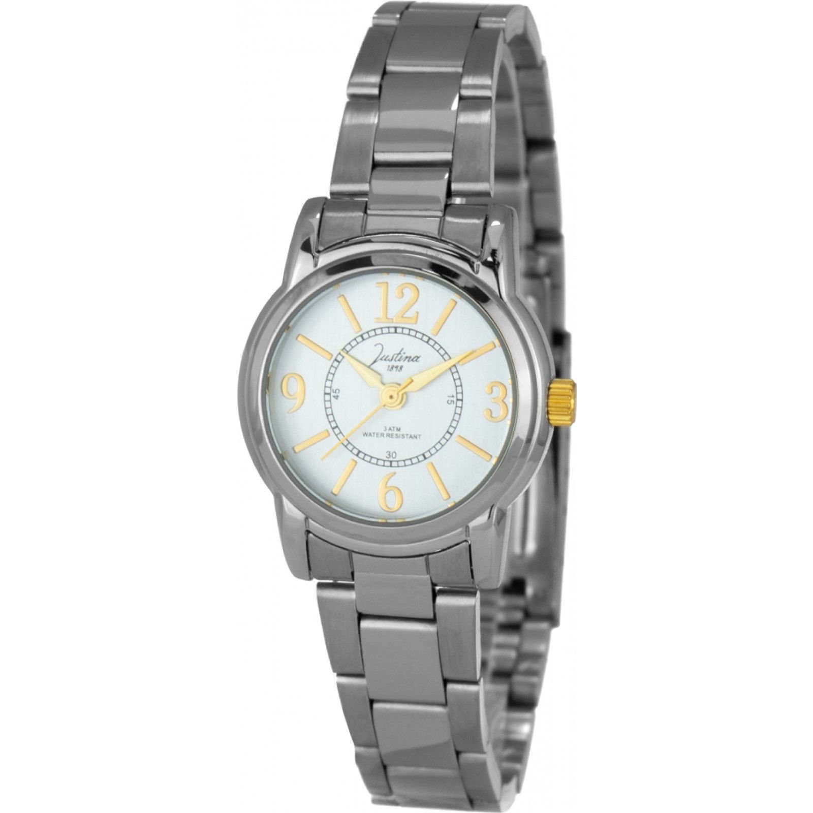 Elegant silver quartz watch from Justina, known for its durability and timeless design. Features a white dial with gold-tone hands and numerals, encased in a polished stainless steel case and bracelet.