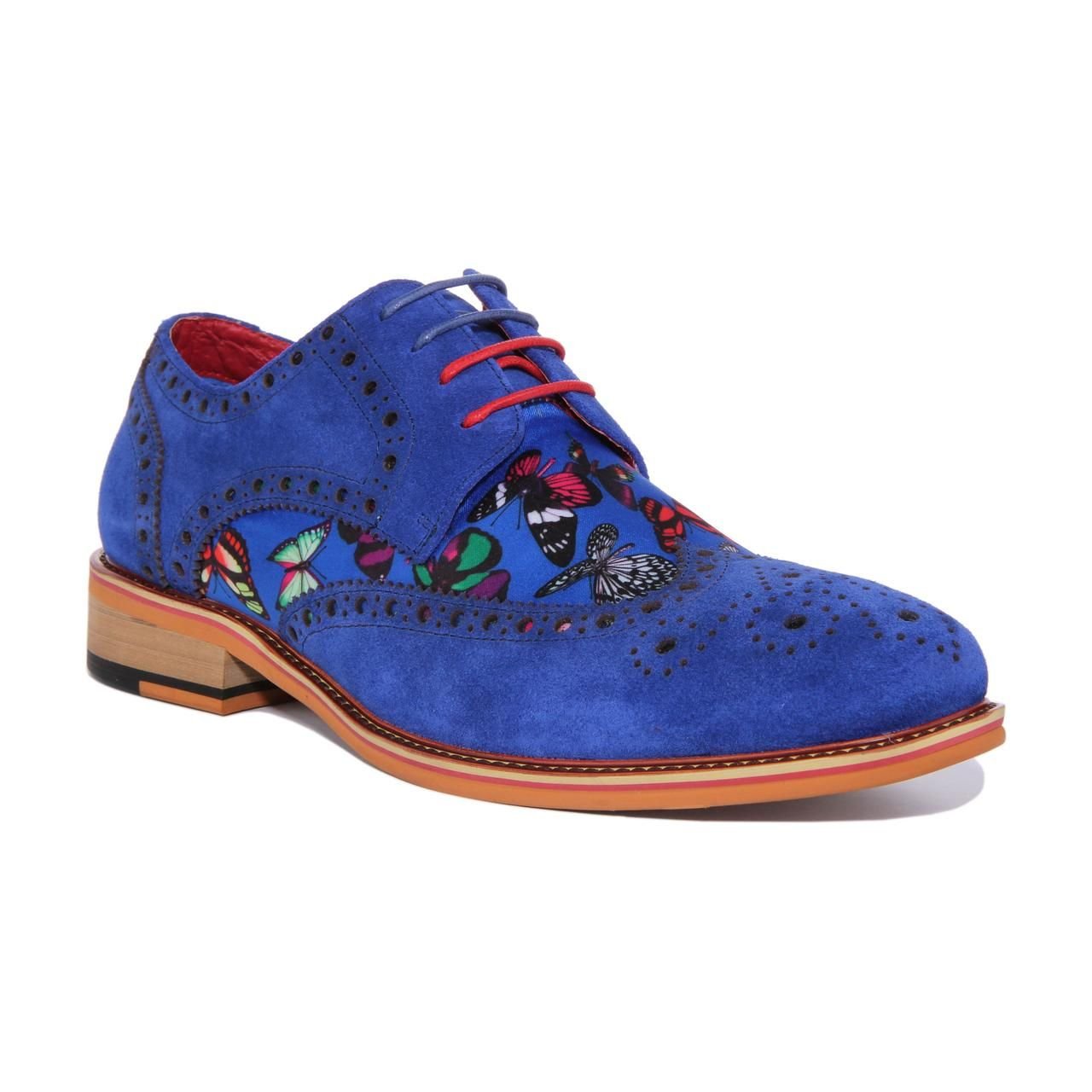 Stylish Navy suede shoes with a butterfly print by JUSTINREESS ENGLAND. Featuring a lace-up closure for a secure fit, these shoes offer soft lining for all-day comfort and a slip-resistant outsole for durability.