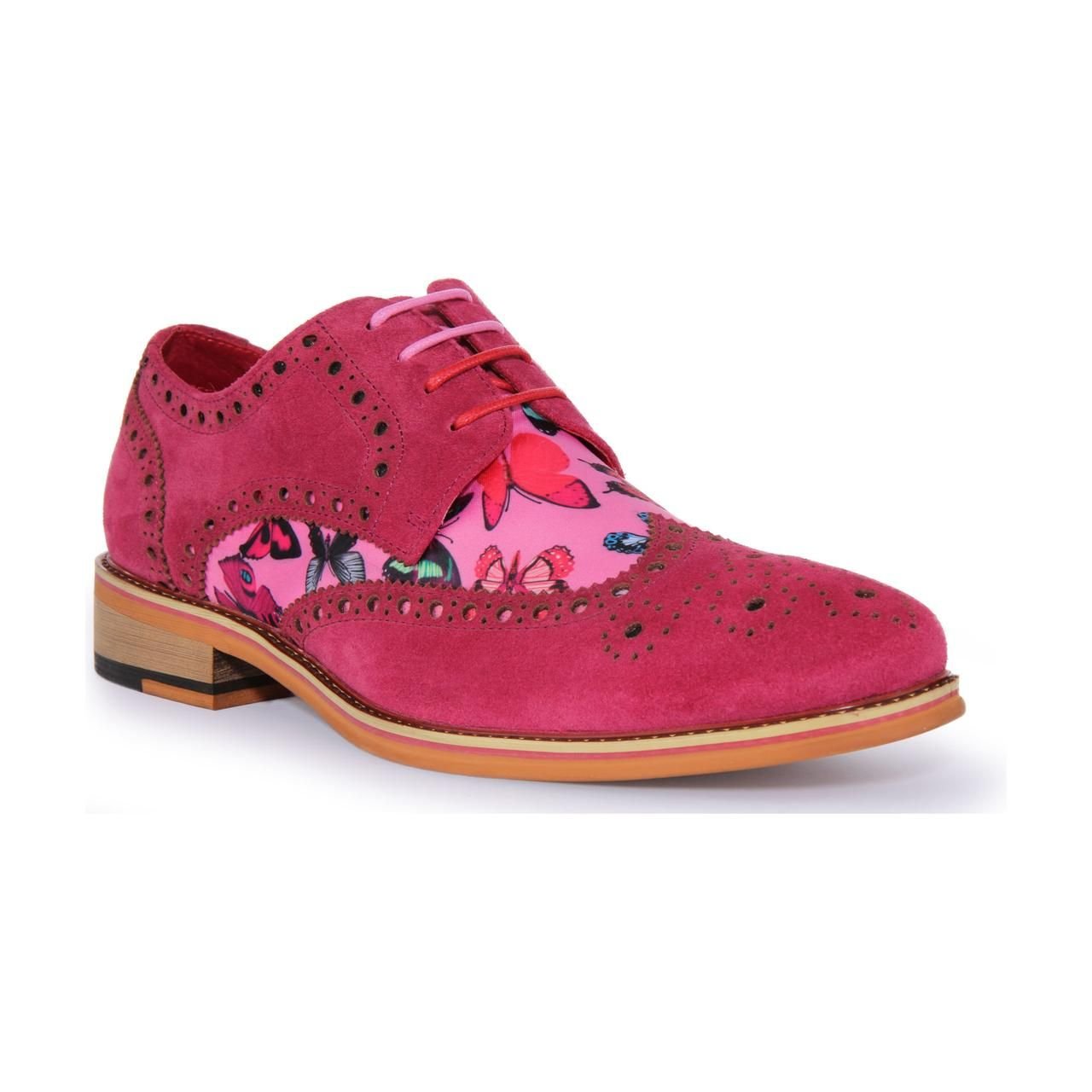 Bold pink suede leather shoes with a unique butterfly print. Featuring a lace-up closure for a secure fit, these shoes offer soft lining for all-day comfort and a slip-resistant outsole for durability.