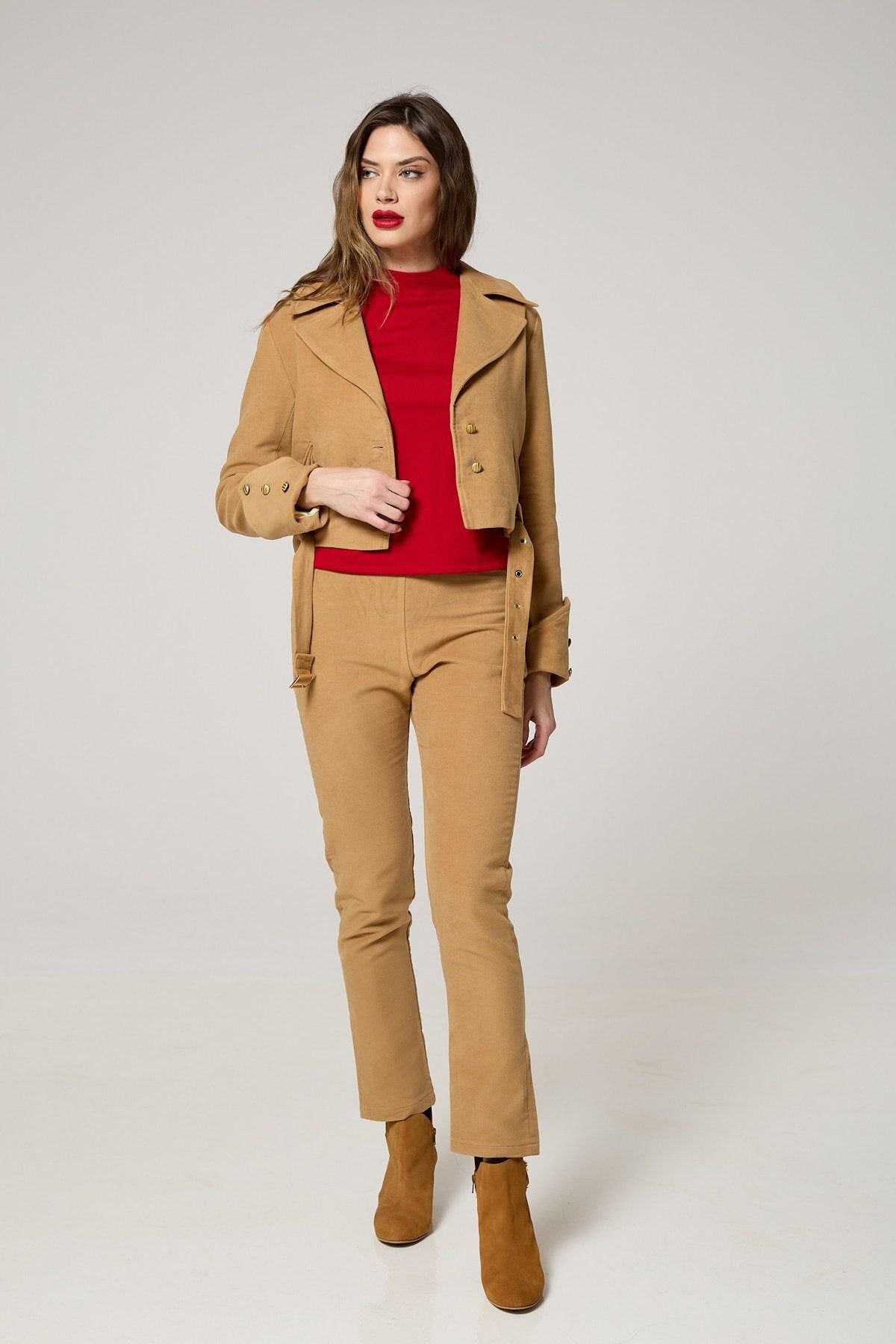 Sophisticated camel moleskin jacket with a soft satin lining for added comfort. Designed for modern, confident women, its tailored fit ensures both style and versatility. Perfect for elevating your wardrobe with an effortlessly elegant touch.