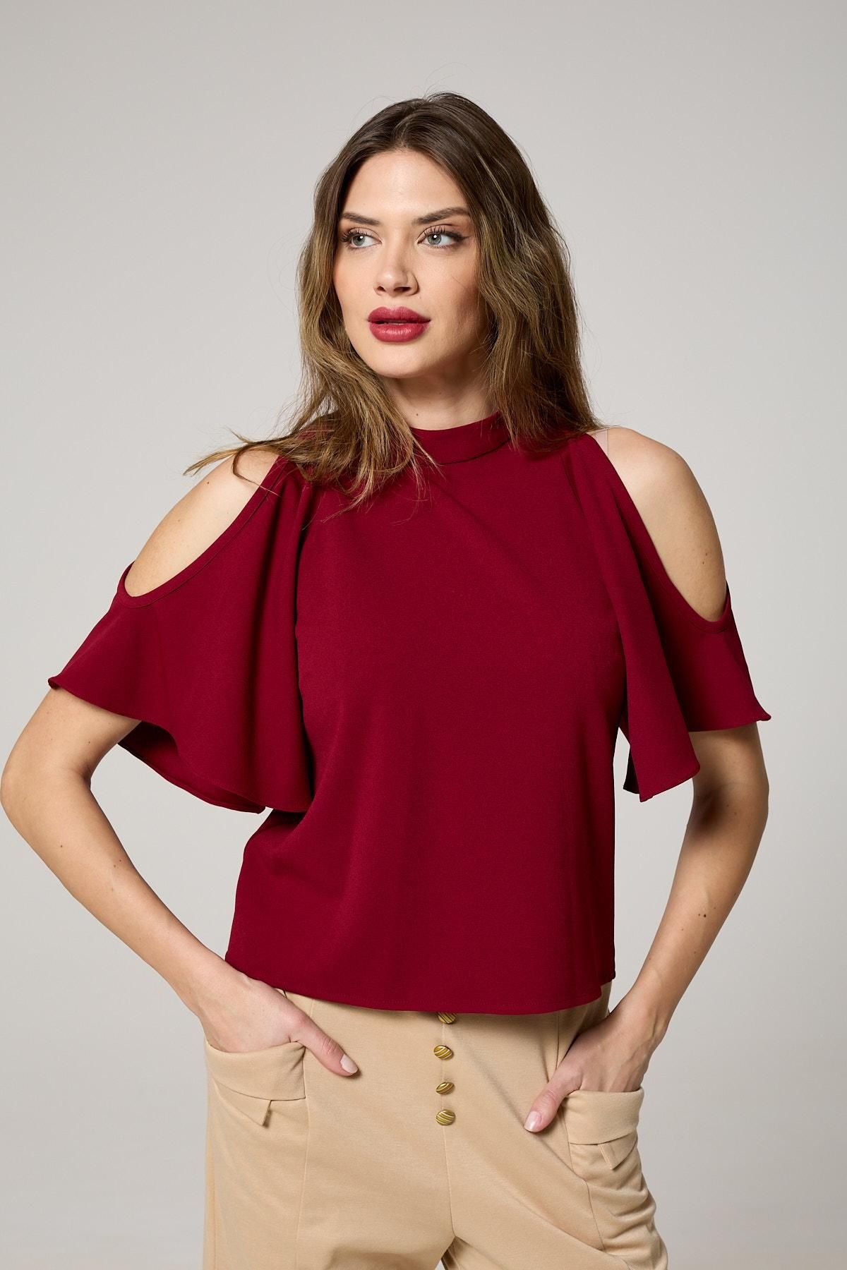 Elegant wine-colored cold-shoulder top with a refined mock neckline and playful butterfly sleeves. Perfect for day-to-night styling, this top pairs effortlessly with tailored trousers.