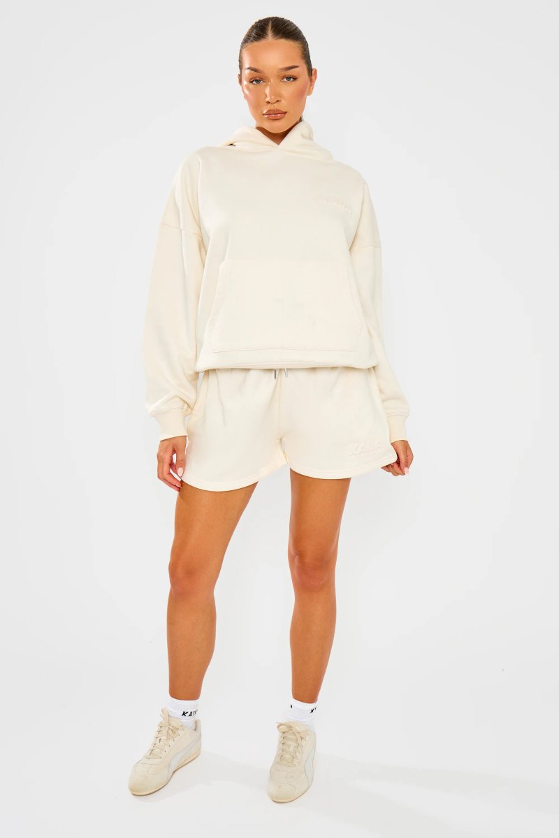 Almond Milk Short-Length Sweat Shorts by Kaiia - crafted in a soft and breathable fabric, perfect for your everyday casual wear. The mini-length shorts offer a relaxed fit, while the embossed bubble logo adds a stylish touch. Designed to be both comfortable and trendy, these shorts are perfect for any casual occasion.