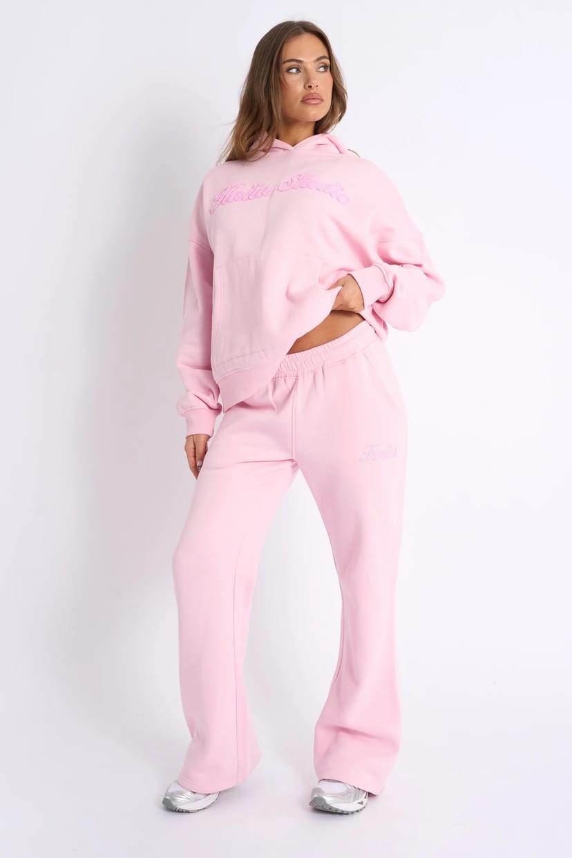 The Kaiia Script Logo Wide Leg Joggers in Baby Pink is available in sizes 14, 16, 18, 8.