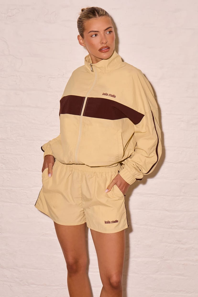 View Kaiia the Label's returns policyLightweight nylon mini shorts in a soft biscuit tone, perfect for warm weather styling. These shorts feature a sleek, minimalist design with a comfortable fit that transitions effortlessly from casual days to evening outings. The breathable fabric keeps you cool while the compact length offers a modern look.
