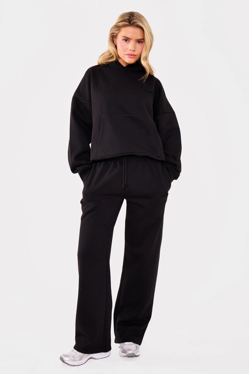 Black Wide Leg Joggers — the ultimate loungewear staple. Crafted in super-soft cotton, these joggers boast a flattering wide-leg silhouette and a subtle embossed logo detail. Perfect for relaxed days and laid-back evenings.