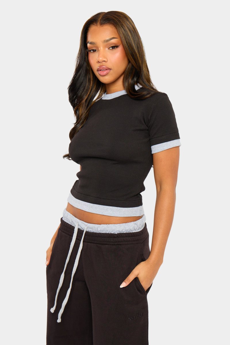 Black & Grey Marl Ribbed Double Layered Baby Tee — the ultimate versatile piece for your wardrobe. Crafted with a sophisticated double-layered construction, this crop top offers depth and dimension while its ribbed fabric provides a flattering, form-fitting silhouette. Perfect for everyday wear, this black & grey marl piece adds a stylish touch to any outfit. Made from comfortable ribbed fabric, it offers a snug fit and effortless style.