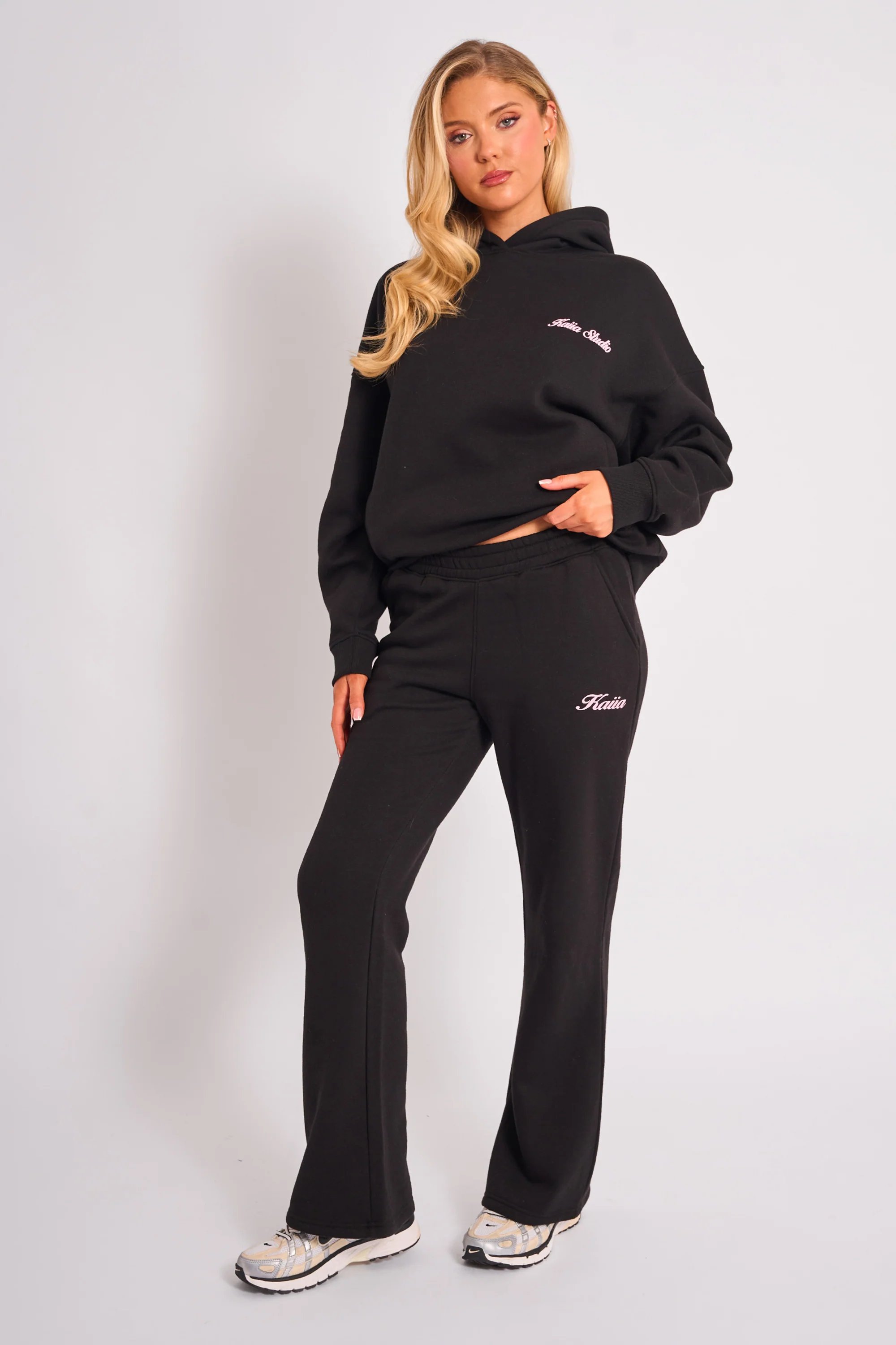 The Kaiia Script Wide Leg Joggers in Black is ideal for casual, lounge.