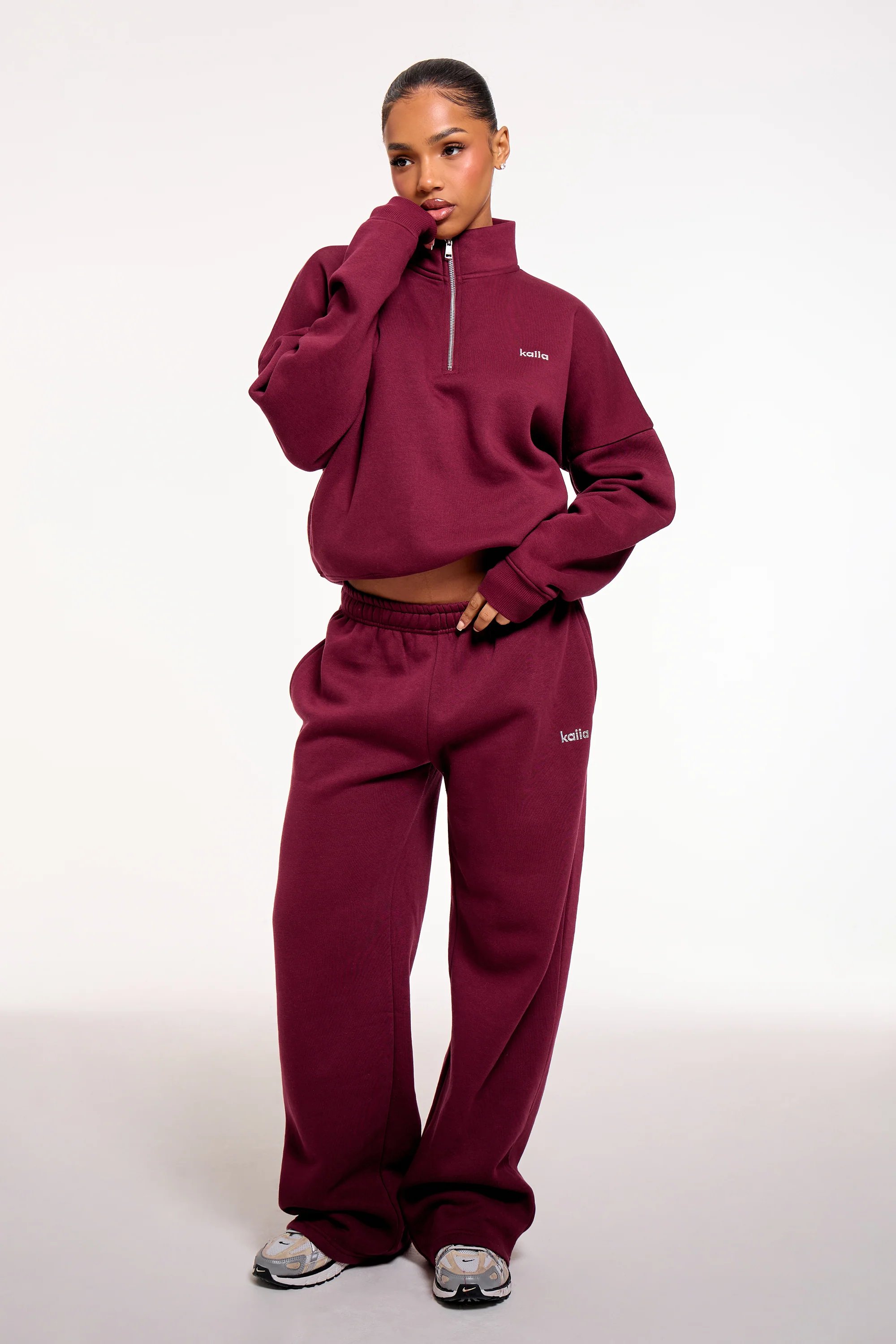 The Kaiia Chrome Logo Mid Rise Wide Leg Joggers in Burgundy is available in sizes 10, 12, 14, 16, 18, 4, 6, 8.