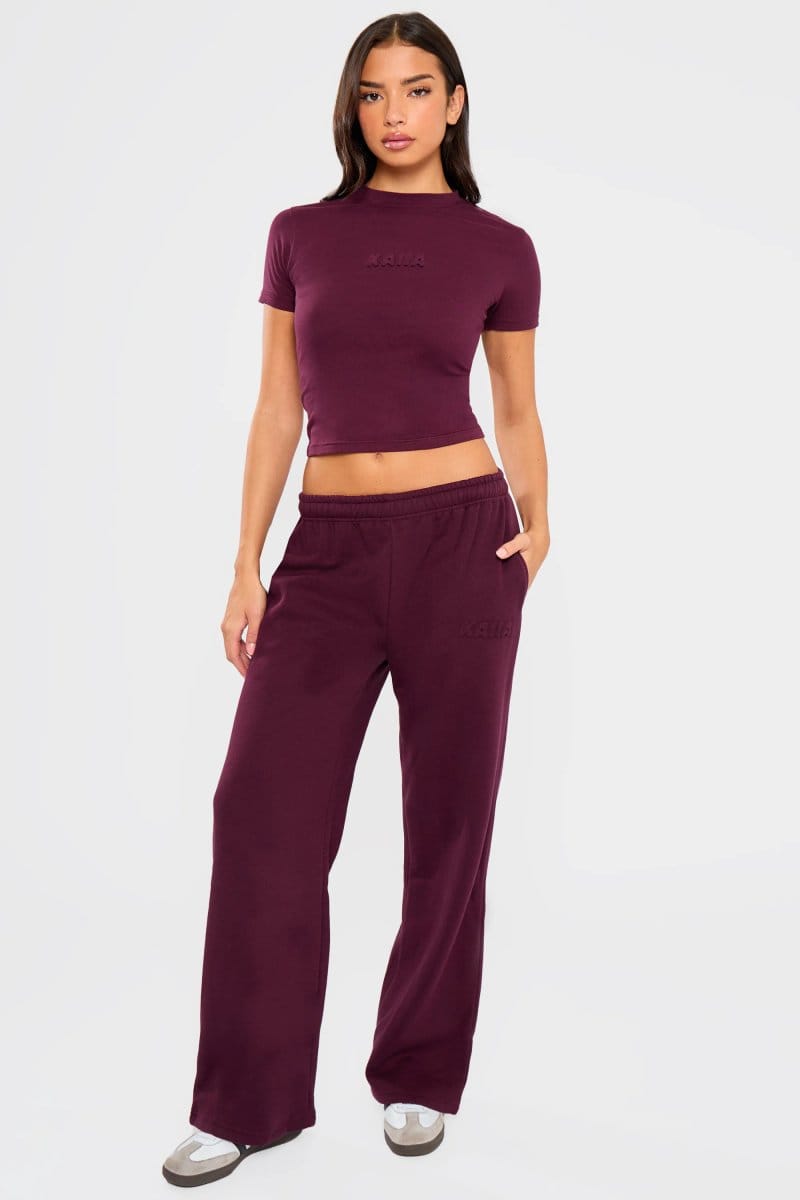 Introducing the Kaiia Embossed Bubble Logo Wide Leg Joggers in Deep Merlot Burgundy. Designed for both comfort and style, these wide-leg joggers feature a unique embossed bubble logo, making them stand out in your casual wardrobe. Crafted from a comfortable cotton blend fabric, they offer a relaxed, breathable fit perfect for everyday wear. The deep burgundy color adds a bold touch to your outfits. Ideal for casual occasions and lounging, these joggers are versatile enough to pair with both casual tops and statement pieces.