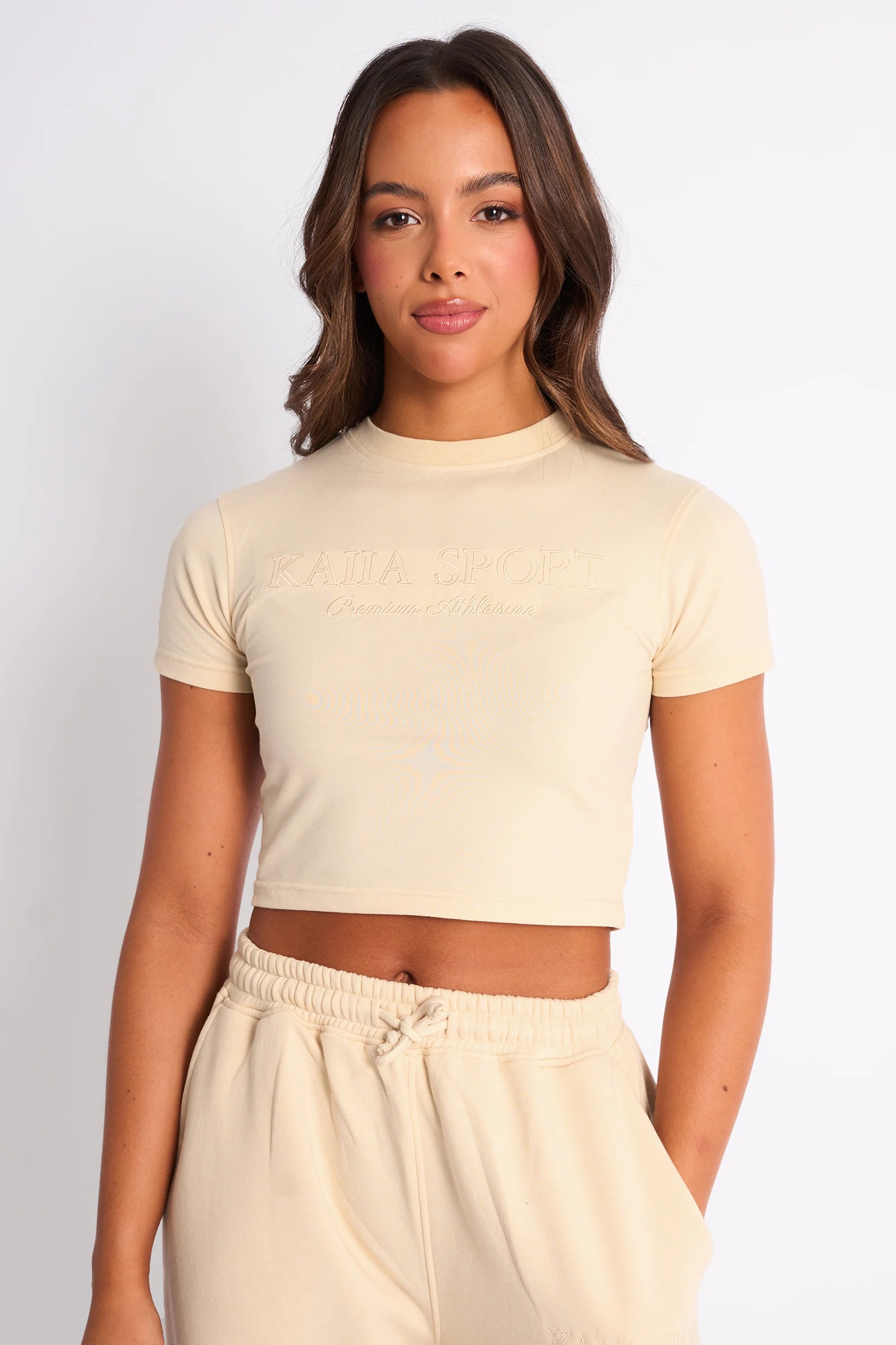 The Kaiia Sport Logo Baby Tee in Buttercream is ideal for casual, lounge.