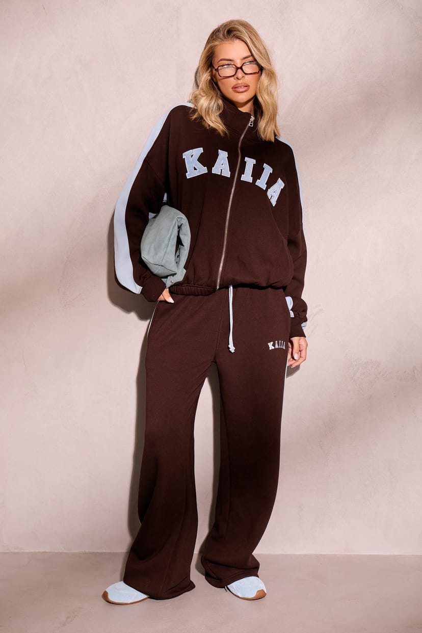 The Kaiia Sport Stripe Wide Leg Joggers Chestnut Brown is available in sizes 10, 12, 16, 18, 4, 6, 8.