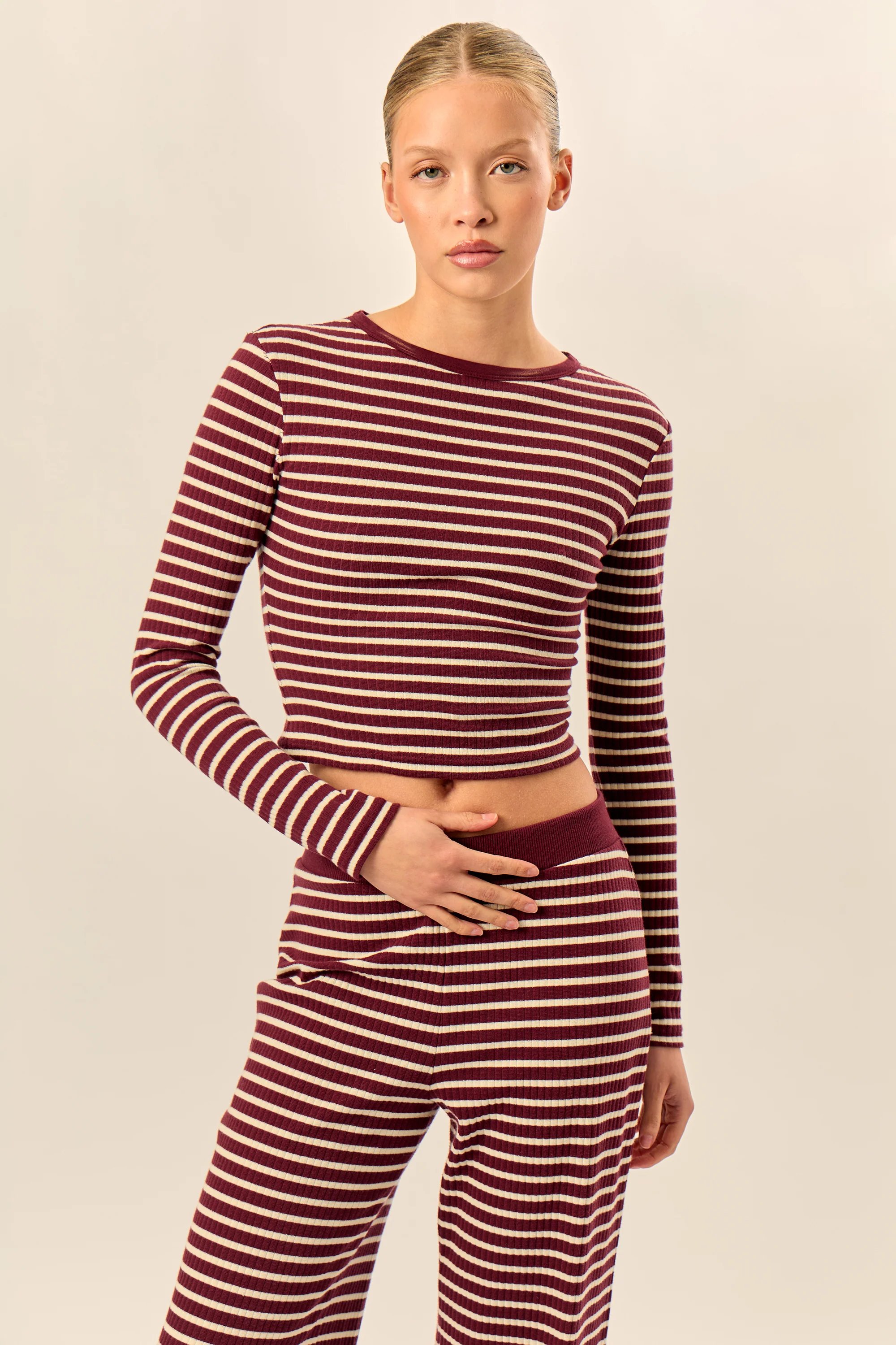 The Kaiia Striped Rib Fitted Long Sleeve Baby Tee in Dark Cherry is made from viscose, elastane.