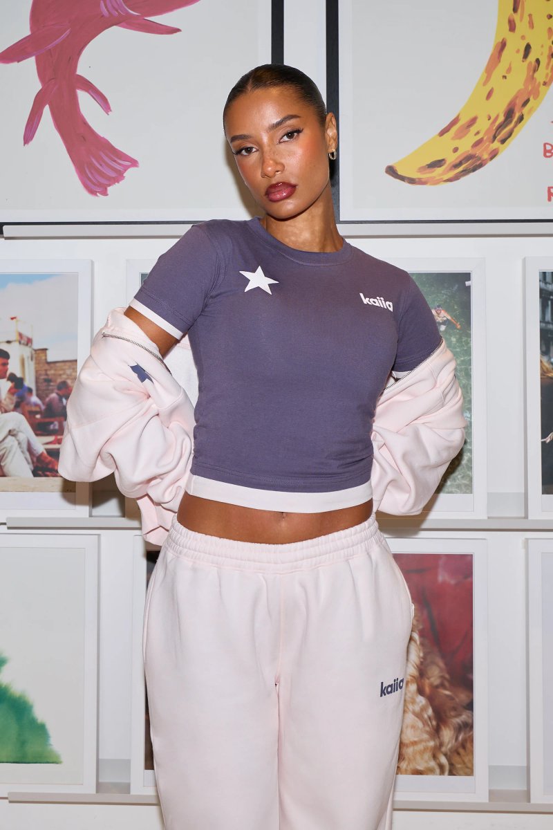 Contemporary baby tee crafted in dark grey and shell pink with a dimensional double-layered star graphic. The classic baby tee cut flatters your silhouette and features a relaxed, comfortable fit. Made from a blend of soft polyester and cotton, it ensures breathability and ease of movement. The tee's versatility makes it perfect for both casual outings and lounging at home.