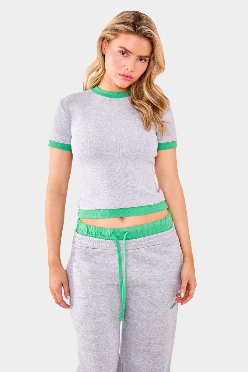 The Kaiia Ribbed Double Layered Baby Tee in Grey Marl and Green is ideal for casual, work, lounge.